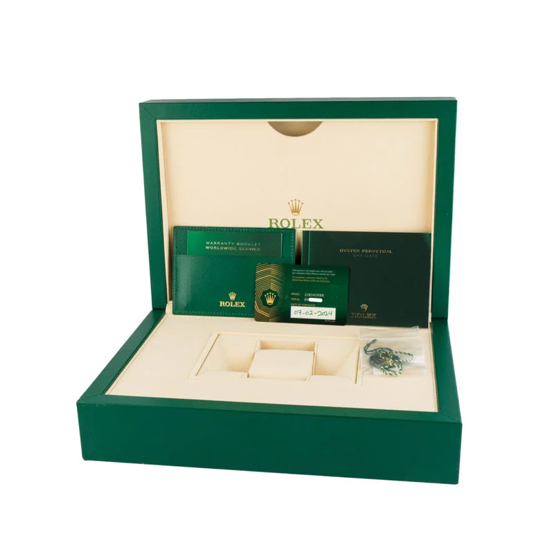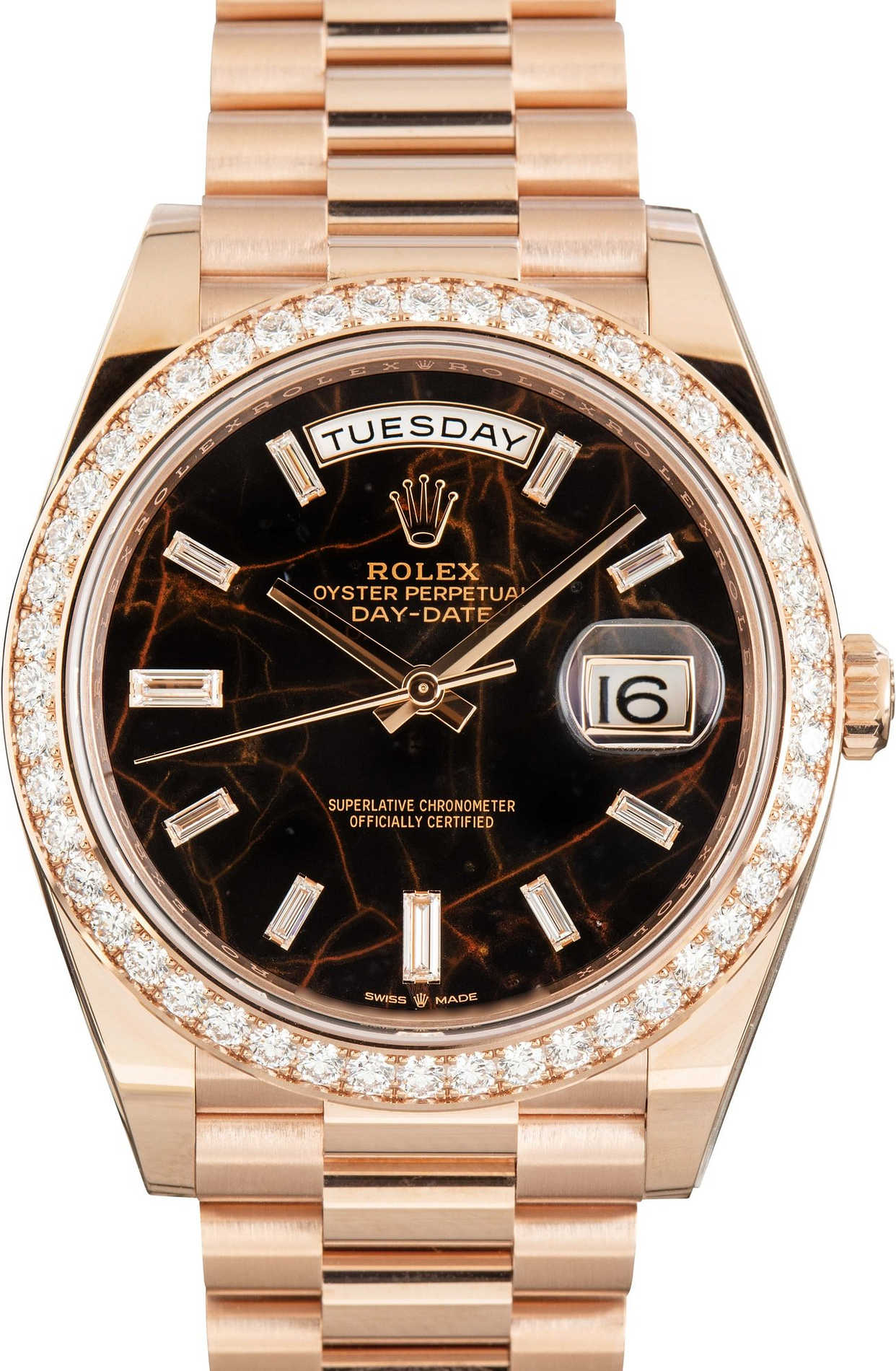 Pre-owned Rolex Day-Date 40 ref 228345 (2024) is an exquisite watch, from the diamond-encrusted bezel to the warm Everose finish and the larger 40mm case size. However, the watch is made even more luxurious and exclusive by its remarkable dial in genuine eisenkiesel, a natural variety of quartz with iron oxide inclusions. It has a rich, smoky brown appearance laced with warm, golden veining, giving it a unique aesthetic from other Day-Dates. Furthermore, eisenkiesel is a German word meaning “iron pebble,” an interesting fact that only adds to the watch’s collectability. Diamond baguettes pop against the stone dial, matching the sparkling diamond bezel while aiding in legibility. This model is the Rolex to buy if you’re in the market for a truly collection-worthy Rolex Presidential.