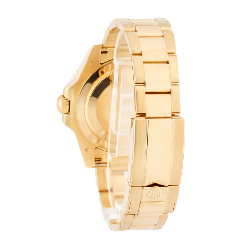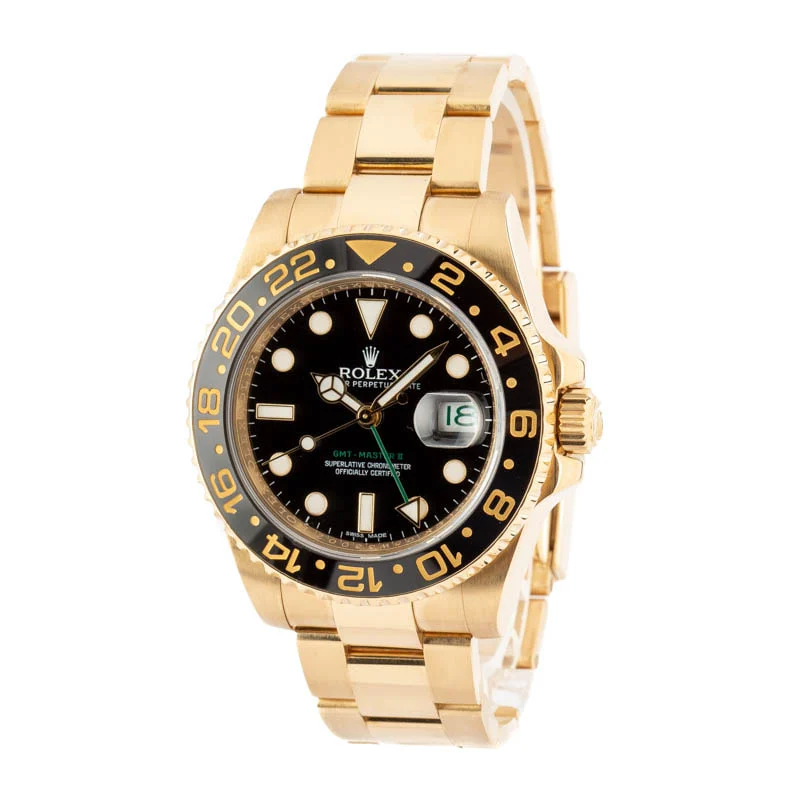 re-owned Rolex GMT Master II ref 116718 (2011) was the first Rolex GMT to sport a ceramic bezel. It came to market in 2005 and continued production until recently when it was discontinued and replaced by the new-model ref. 126718 in 2023. Initially, the watch had a green anniversary dial and was later replaced by the black dial Rolex 116718 for sale here. This important model laid the groundwork for the rest of the collection as we know it today and is a very prized collector’s item in many watch-collecting circles. Furthermore, it exudes prestige and class like no other GMT in lustrous yellow gold. The bezel features Rolex’s signature “Cerachrom” insert and golden 24-hour graduations. Also, the ref. 116718 displays the time on a sharp black “Maxi” dial with larger luminescent hour markers and wider hands. The GMT hand and GMT Master II logo are both presented in vibrant green, giving the watch its signature look.