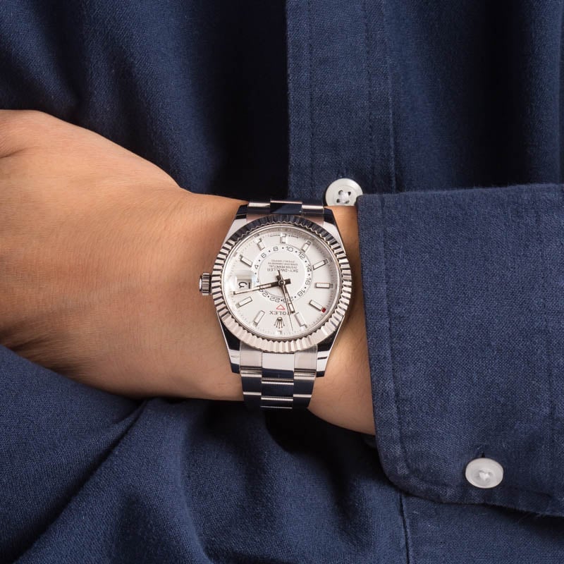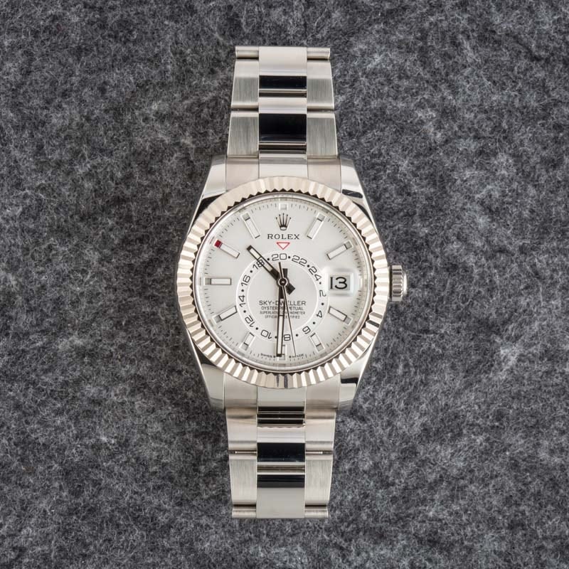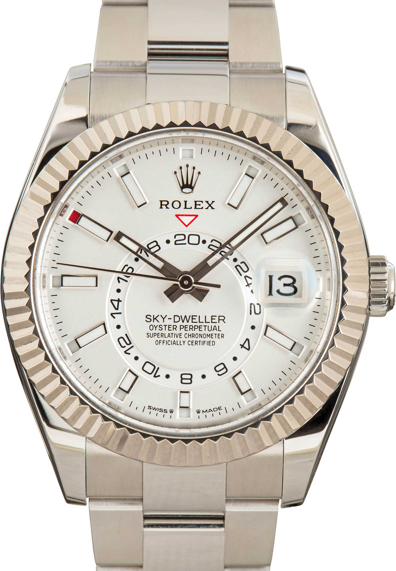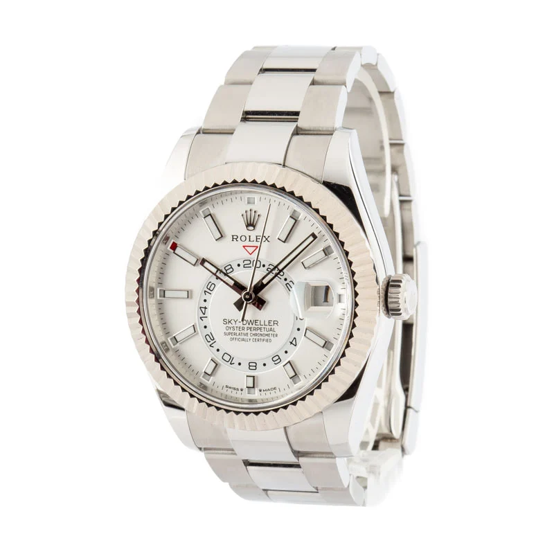 Pre-owned Rolex Sky-Dweller ref 336934 (2023) is the current-production White Rolesor model, released in 2023. In addition to including a fresh selection of colorful dial options, ref. 336934 also utilizes the next-generation caliber 9002 movement. This model is among the top echelons of Swiss watchmaking, and it can be yours today for a very competitive used Rolex price. Features include a desirable White Rolesor finish, pairing 904L-grade Oystersteel with an 18k white gold fluted bezel. The handsome white dial is decorated with contemporary Chromalight batons and displays the month above each hour marker and the date at 3 o’clock. The 24-hour scale circling the dial’s center allows for convenient, dual timekeeping. Lastly, this stunning Rolex is presented on a silky Oyster bracelet.