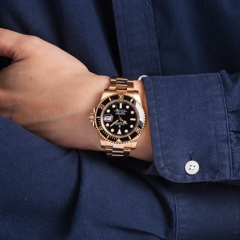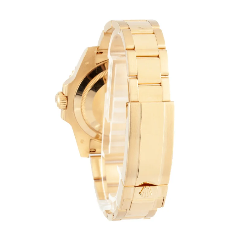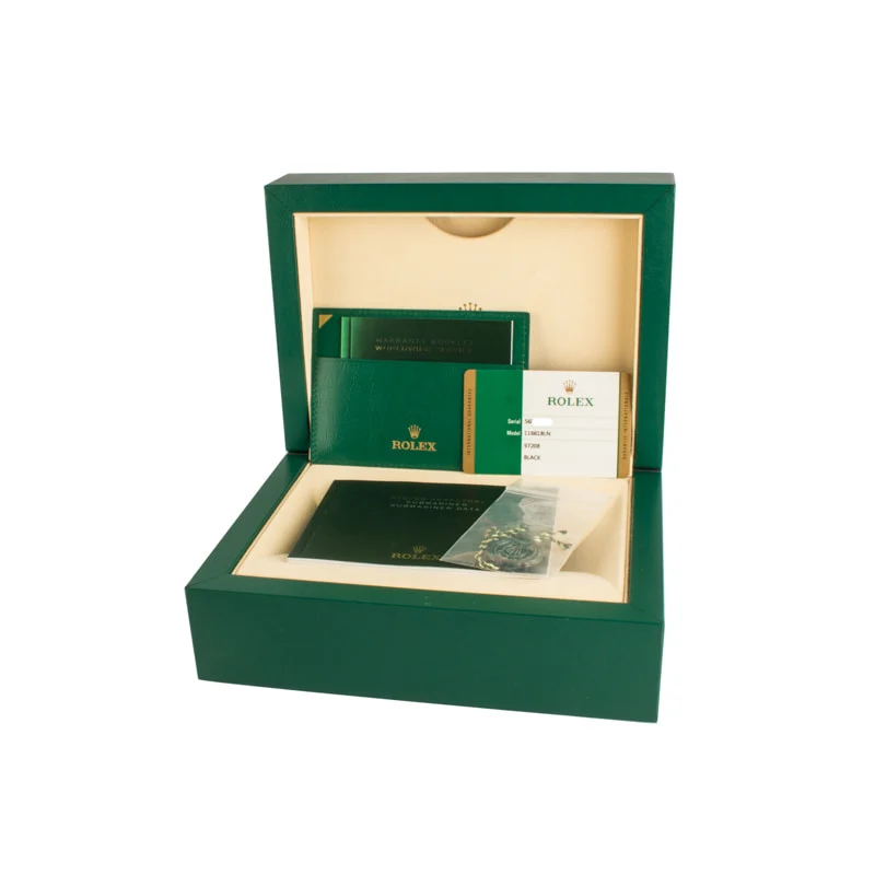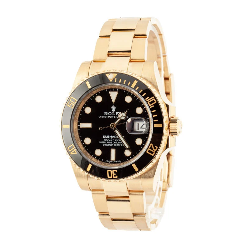 Pre-owned Rolex Submariner ref 116618 (2018). The first generation of 6-digit Subs took the collection from the older-style case with more tapered lugs to the “Super Case” we know today, featuring broader, more contemporary lugs and a larger crown guard. It also features a 40mm diameter and is the first instance of the ceramic bezel and Maxi dial within the dive watch collection. The ref. 116618 is the first all-gold edition of the 6-digit series that was recently discontinued to make way for the 41mm collection. Its status as both a gold Rolex and a discontinued model makes ref. 116618 highly collectible. It’s also an excellent chance to add a coveted gold Rolex with a black dial and matching black ceramic bezel to your collection for a very competitive price.
