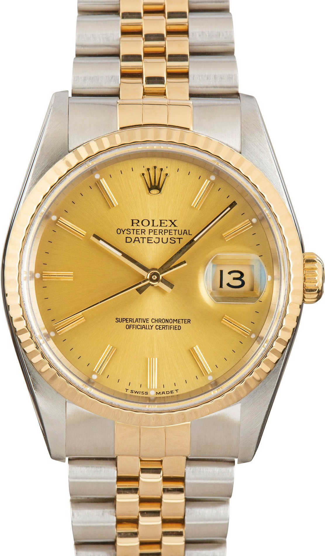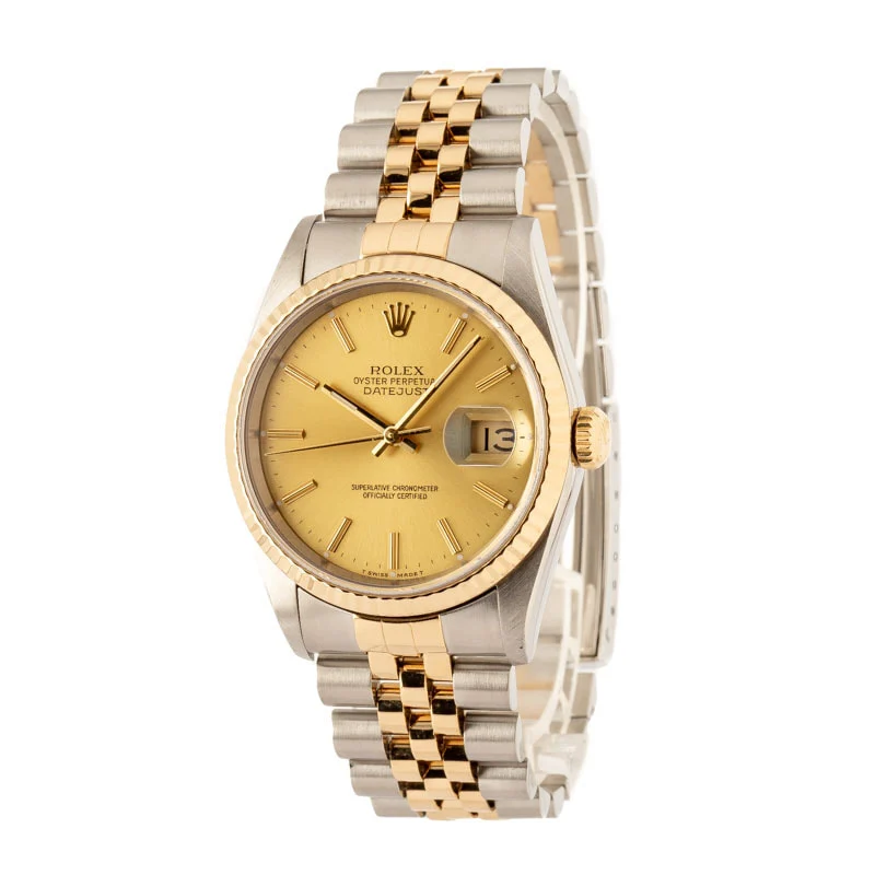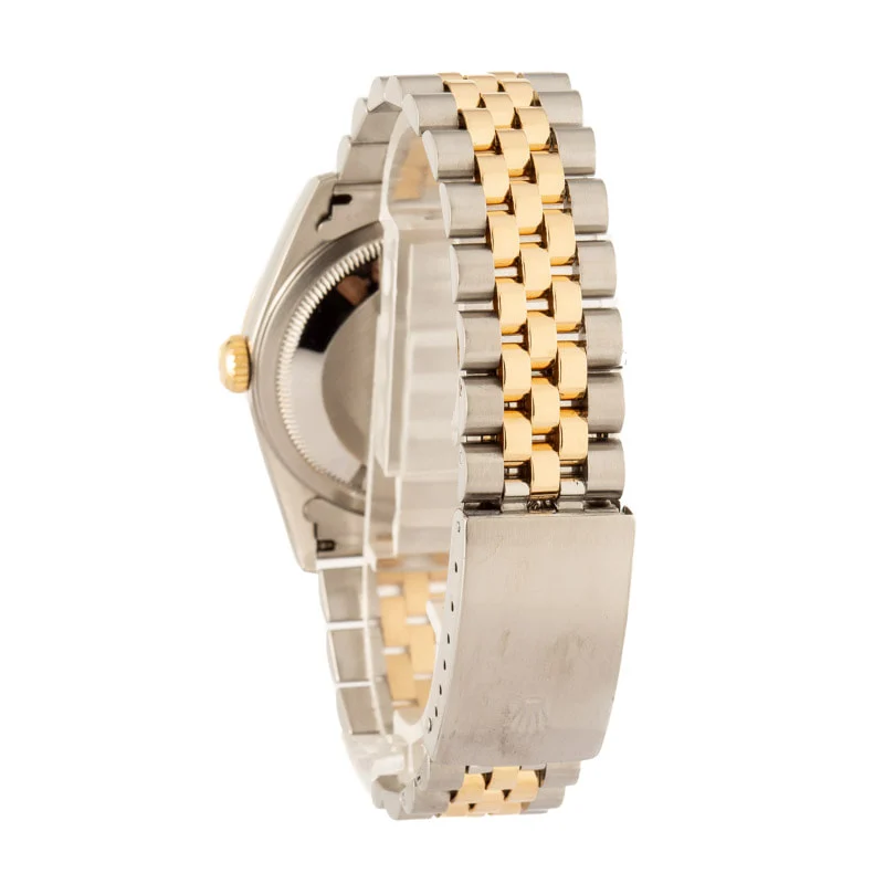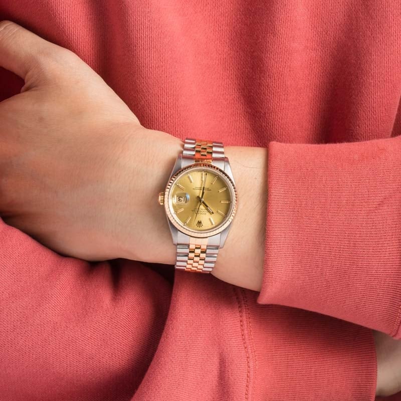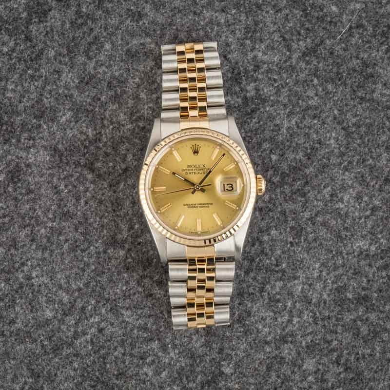 Pre-owned Rolex Datejust ref 16233 (1996) is one of the most iconic editions of the DJ 36. Rolex made this model between the late 1980s and the mid-2000s, during which countless notable wearers donned the watch on their wrists, including Paul Newman in The Color of Money and Christian Bale in American Psycho. The ref. 16233 always features a stainless steel and 18k yellow gold finish, a 36mm waterproof Oyster case, a fluted bezel, and a self-winding mechanical movement. While Rolex outfitted the watch with many different types of dials during its decades-long production run, champagne remains the most popular because it effortlessly matches the two-tone finish. This model also sports Tritium lume and the famous Rolex Jubilee bracelet.